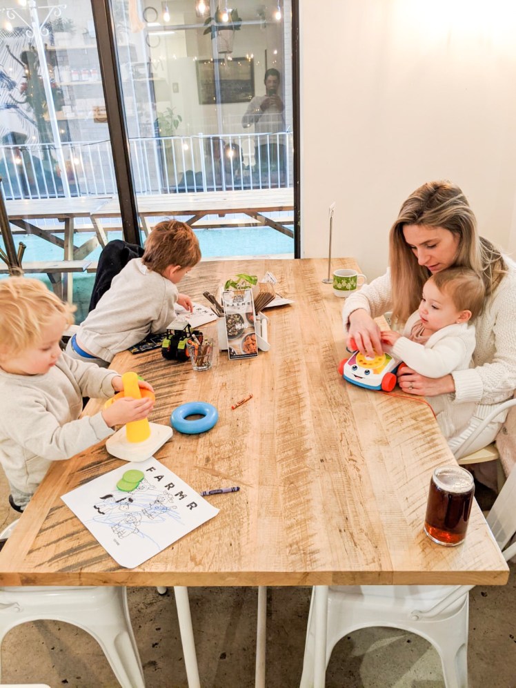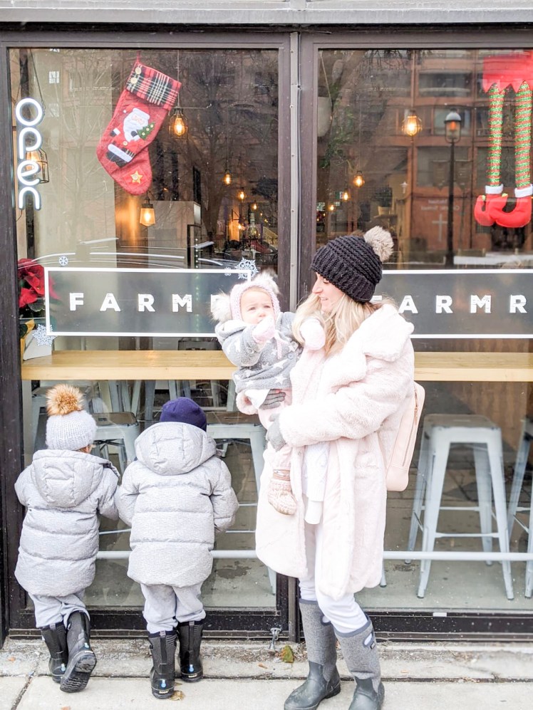 This year after our morning at the Market, we made our way to Farm’r; a welcoming and casual, farm-to-table restaurant located right beside the St. Lawrence Market and walking distance from the Christmas Market. From the moment we walked in to Farm’r we felt like our family was at home (and so did our kids). Farm’r has included a lot of little touches in their restaurant that really do speak to families. From the kids toys, to the well-thought-out bathroom spaces, (yes as someone who has been bringing babies and kids to restaurants for the past four-and-half-years this is so important and makes a world of difference) they’ve really considered kids and families when planning out their space.